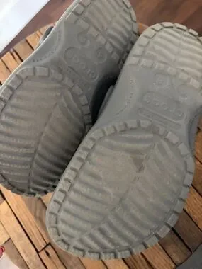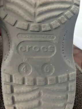 Light gray Crocs slip-on clog. Textured outsole with Crocs branding. Simple, functional design for everyday wear.unisex Men’s Size 4 Wonens size 6