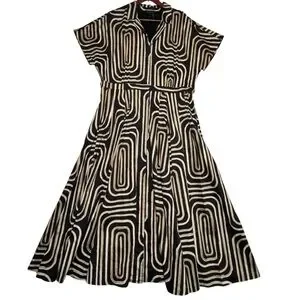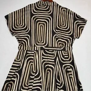 Stylish midi shirt dress with a striking geometric swirl print. Short sleeves and a classic collar create a refined silhouette. Fitted waist with a belt for a flattering shape. Flowy skirt offers graceful movement. The belt has been missing. Excellent condition.