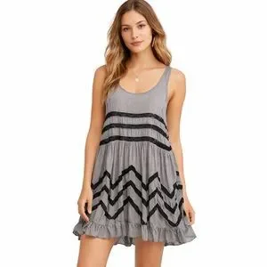 Free People Intimately Free People sleeveless tunic tank featuring a soft gray micro-polka dot fabric with layered black lace trim and a flowy ruffle hem. This lightweight boho piece can be styled as a tunic top or mini dress and pairs beautifully with leggings, denim, or shorts.