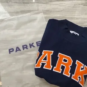 Parke navy crew sweatshirt with bold orange collegiate lettering. Soft, cozy fabric designed for everyday wear. Classic crewneck silhouette that layers easily. Bright orange letters add a sporty, standout detail.