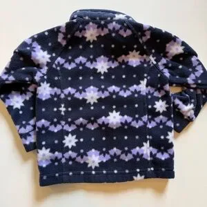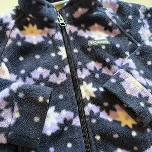 Cozy Columbia fleece jacket in navy with purple and white star patterns. Perfect for chilly days.