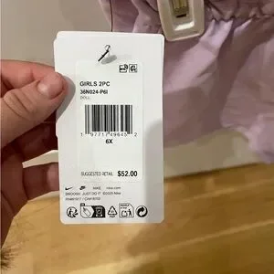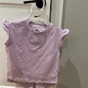 Two-piece athletic set with a cropped tee and elastic waist shorts. Soft lilac fabric with white Nike logo on both top and shorts. Lightweight and sporty design.