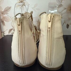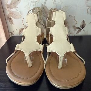 Stylish cream gladiator sandals with T-strap design. Padded footbed for comfort. Zip-back closure for easy wear. Versatile neutral look for many outfits.
