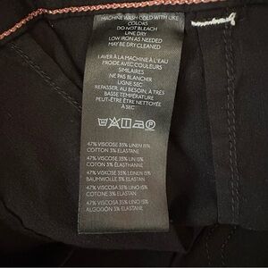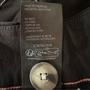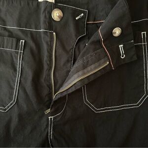 The MAEVE Colette Crop Wide-Leg Pants Contrast-Stitch Edition in size 31 are a fashionable and versatile choice for any season. The black viscose pants feature a high rise and a wide-leg fit, making them suitable for various occasions including travel, parties, casual outings, workwear, and business meetings. Stylish accents like contrast stitching, zip, and button closures add a touch of bohemian flair to the cropped design. Perfect for adding a chic and trendy twist to your wardrobe.
