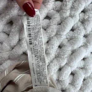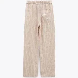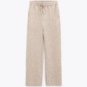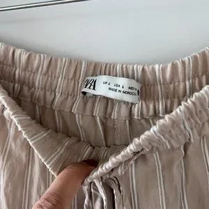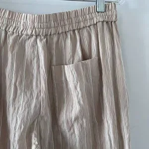 In excellent used condition. Zara striped textured weave pants in Beige size L. Soft textured weave; viscose/polyester/polyamide. Tan with white pinstripes. Elastic waist with drawstring tie. Pull on. Slanted front pockets. Single back patch pocket. Wide straight legs.