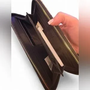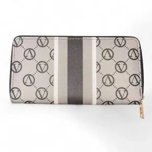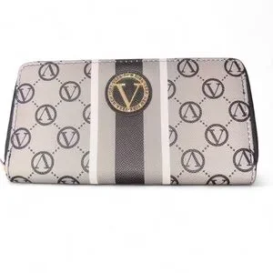 Vera Wang New York “Vera Signature” zip-around wallet featuring the signature “V” monogram print with a neutral stripe design and gold-tone logo medallion. Classic, functional design with plenty of storage—perfect for everyday use.