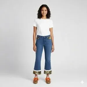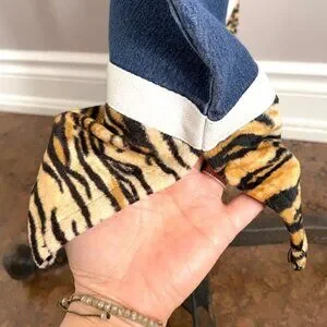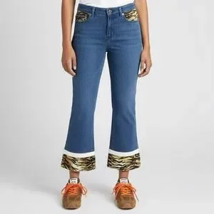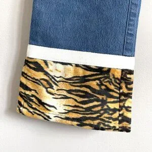 Mid-wash denim w/ faux Tiger print trim