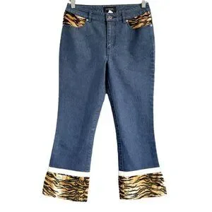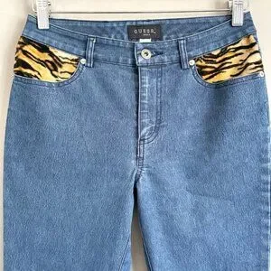 Mid-rise, cropped, boot cut, jeans with animal print trim and side slits at bottom hem. Vintage Guess from the Y2K-era.
