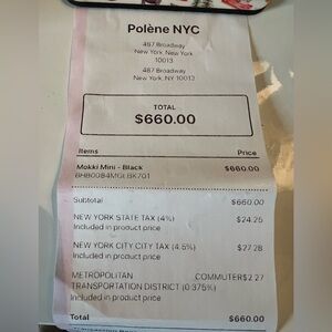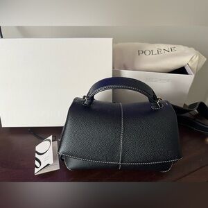 Black Polene Mokki Mini purchased May 2025. Beautiful bag used sparingly and is in excellent condition. Includes adjustable shoulder strap. Measurements & original receipt included in pictures.