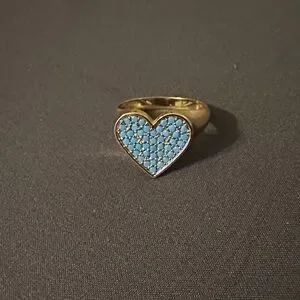 Chic gold ring with a heart shape. Features vibrant turquoise accents. Ideal for any occasion.