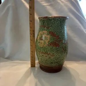 decorative ceramic pitcher, likely produced in a rustic or folk art style, featuring a speckled green glaze with painted floral and scroll designs. Beautiful green ceramic vase with orange floral design. Perfect for home decor.