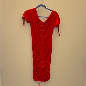 Bold red bodycon midi with center ruching. V-neck and short sleeves with tie accents. Sleek, figure-flattering fit. Adjustable ruched hem for styling.wore 1 time on vacation