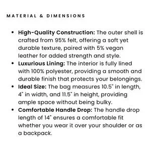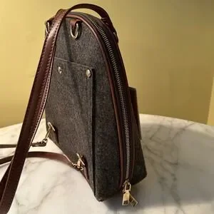 Keywords: felt backpack, convertible bag, vegan leather, zipper closure, double zipper, backpack, interior pockets, exterior pockets, shoulder bag, travel bag, everyday bag, work bag, casual backpack, modern, stylish, school bag, urban chic, streetwear, vacation