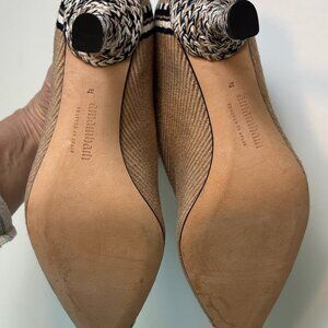 ankle boots, woven boots, textured fabric, sculptural heel, kitten heel, pointed toe, european designer, spanish shoes, artisan, neutral palette, tan boots, black trim, ivory detail, contemporary, minimalist, modern, architectural, statement shoes, fashion forward, capsule wardrobe, elevated basics, quiet luxury, old money, parisian style, italian style, city chic, polished, tailored, refined, fall shoes, spring shoes, transitional, boutique designer, rare find, unique footwear, artful, sculptural fashion