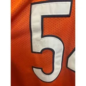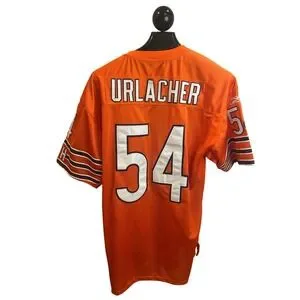 Authentic Reebok NFL Equipment Onfield Chicago Bears Brian Urlacher jersey. This mesh jersey features high-quality stitched name and numbers, including the iconic #54 on the front, back, and shoulders. Detailed with the GSH (George Stanley Halas) memorial stripes on the sleeves and the NFL Equipment shield at the V-neck. Constructed from durable 100% polyester, it includes the official jock tag at the hem. Note: There is some light staining on the front white number 5 as shown in photos. Please note the staining on the numbers as shown in the picture.
