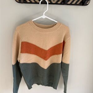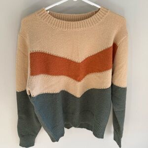Cozy color block chevron sweater by Baltic Born! Dark green, rust orange, and beige/tan earth tone colors. A stunning sweater - perfect for fall and winter cooler weather.