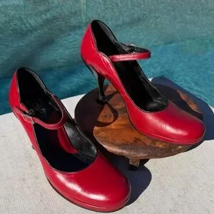 Rear John Fluevog Listen Ups Stacey Red with Black Piping. John Fluevog heels "Listen Ups Stacy" pumps These gorgeous heels have an adjustable baby doll ankle strap closure, and Toby protectant soles on the bottom of the heels. Soft analine leather upper and lining. Hourglass 4" heels & 1/4" platform.