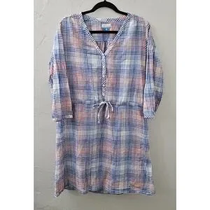 Columbia Women's Dress 3/4 Sleeve Size Large Blue Coral 100% Cotton Checkered