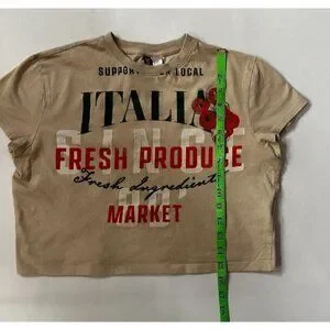 A fun, casual statement piece from Divided by H&M, this cropped graphic tee features a bold “Fresh Produce / Italia Market” design in rich green, white, and vibrant orange tones. The khaki-beige base gives it a warm, earthy feel that pairs perfectly with denim, skirts, or layered looks.
