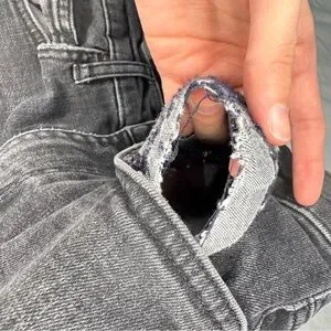 One front pocket has a large hole inside the pocket bag. This is not visible when worn and only noticeable when the pocket is pulled out. Priced accordingly. No other holes or stains noted.