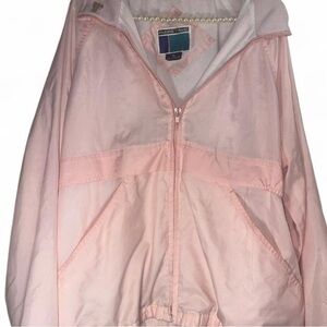 Vintage Zip-front women's bomber jacket by Pacific Trail. Lightweight shell with hood. Front pockets and elastic hem for a secure fit. Soft pale pink color.