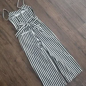 Sleeveless striped jumpsuit with adjustable spaghetti straps. Self-tie waist for a cinched look. Wide-leg cropped pants for easy movement. Vertical stripes elongate the silhouette.
