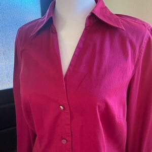 Ann Taylor button-up blouse in a rich burgundy hue. Features a classic collar and long sleeves. Clean, polished look for work or weekend styling.