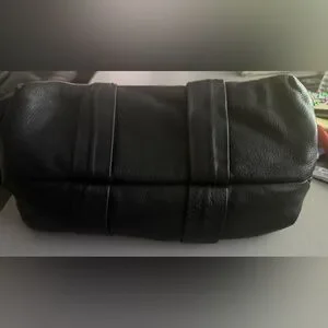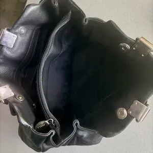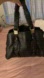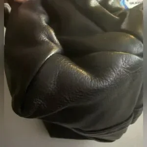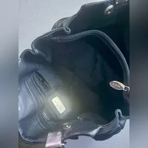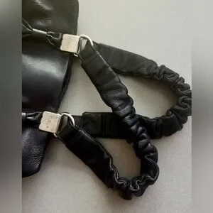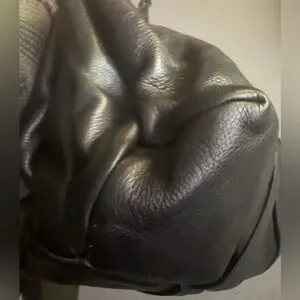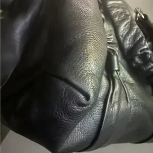 Black distressed leather bag with silver tone hardware, bow accented on front and back and gathered top handles