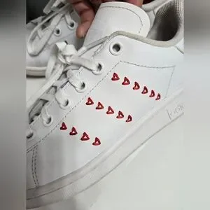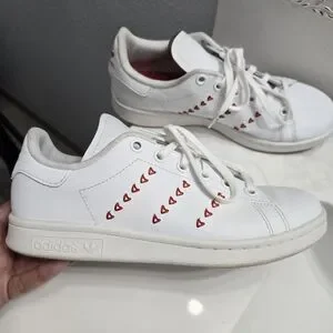 Adidas Stan Smith Valentines Day Sneakers. Stylish women's sneakers featuring a sleek white design with red heart accents. Perfect for casual outings and everyday wear. Does not come with original box. Kids size 4.5 womens size 6. In good condition with minor wear throughout as seen in pictures.