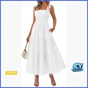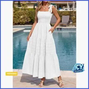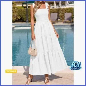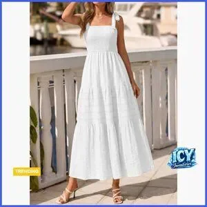A loose-fit, bohemian-style dress featuring a smocked bodice and tiered A-line silhouette. Perfect for beach vacations, wedding guest events, parties, and spring or summer occasions.