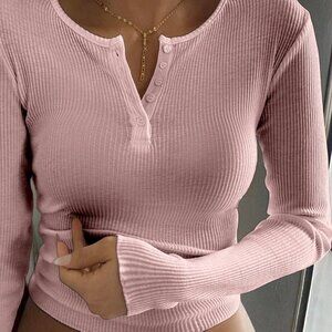 Pink Casual Women's Button Ribbed Pleated Long Sleeve T-Shirt