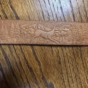 Vintage genuine leather belt featuring a detailed continuous tooled forest and deer scene throughout the entire strap. Really nice craftsmanship with raised wildlife design including bucks, does, and wooded scenery—classic western/outdoors look.