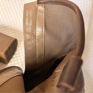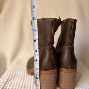 Sleek brown ankle boots with a sturdy block heel. Smooth upper with subtle stitching details. Easy pull-on tabs for quick wear. Vegan man made construction.