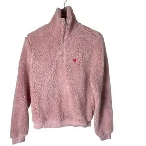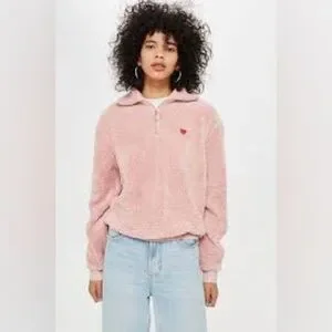 Women’s TopShop Pink Borg Heart Quarter Zip Fleeve Pullover Sweater Size 6 US!