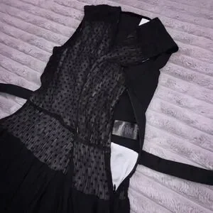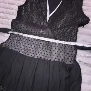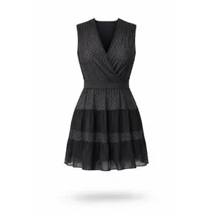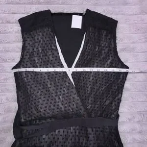 Sleeveless mini dress features a sophisticated wrap-style V-neckline and a tiered skirt with delicate swiss dot mesh paneling. Crafted with a defined waistband and a removable belt, this piece offers a feminine silhouette with subtle sheer detailing throughout the bodice and skirt. The lightweight fabric and airy design make it an ideal choice for cocktail parties or elevated daytime events.