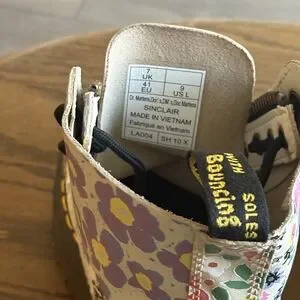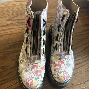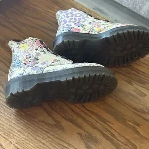 Dr. Martens Stylish women's floral lace-up platform boots in pink multi. Durable platform sole with contrast stitching for an edgy look. Smooth floral-print upper offers eye-catching color and pattern. Comfortable fit for all-day wear.