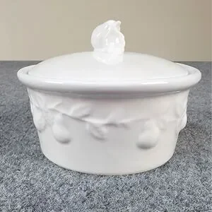 Vintage Lillian Vernon White Pears and Leaves Round Mini Casserole with Lid 5"