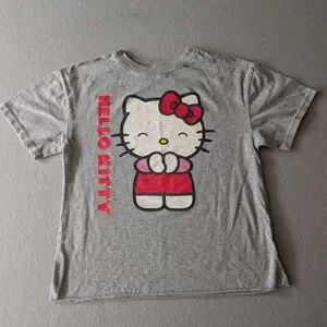 Sanrio Hello Kitty Medium Gray Graphic Short Sleeve T-Shirt with Raw Hem in Size Medium. Perfect kawaii kidcore retro vintage 90s inspired tee. Neutral and easy to pair with jeans or elevated basics for anime and Sanrio fans. Polyester cotton lightweight blend.