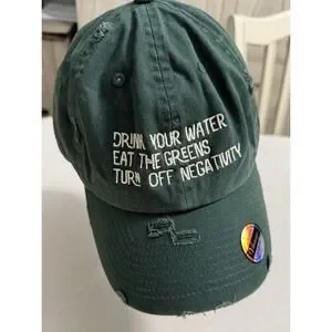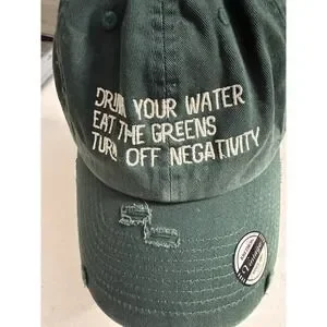 Trendy KBETHOS vintage style distressed dad hat in forest green featuring embroidered motivational quote "Drink Your Water Eat The Greens Turn Off Negativity." Perfect for streetwear, casual, minimalist, grunge, normcore, and wellness aesthetic looks. Adjustable strapback for comfortable unisex fit.