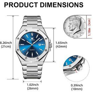 The men's watch case diameter is 42 mm, case thickness is 10 mm, weight is 147 g, strap width is 26 mm, and strap length is 210 mm. Silver stainless steel strap, fashionable and luxurious, secure folding clasp, comfortable and convenient to wear This men's quartz watch features a octagonal dial design and a date display, combining minimalist with practicality for time management. This classic men's watch elevates your style to a new level with its elegant and refined appearance