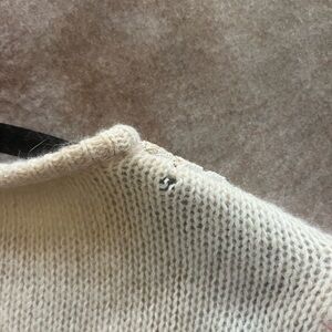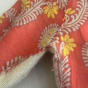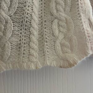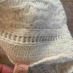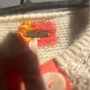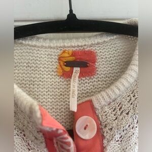 The VTG Y2K Free People Gilmore Girls Lane Kim Cottagecore Retro Famous Cardigan is a vintage piece with a Fair Isle pattern, 3/4 sleeves, and a Crew Neck neckline. Made from a blend of cotton, wool, and angora, this cardigan features accents like crochet, buttons, beads, and embroidery.