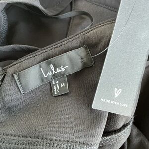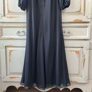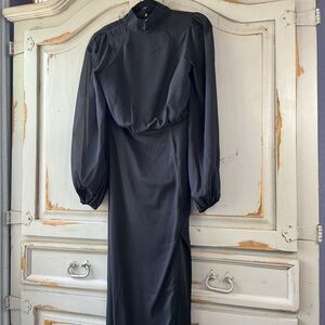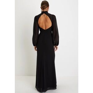 NWT Lulus Graceful Entrance black chiffon long sleeve backless maxi dress with high left leg slit, size medium. Long sheer balloon sleeves, mock neckline with two loop button closures, and hidden back zipper. Excellent condition without flaws.