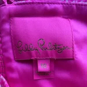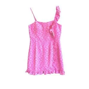Lilly Pulitzer Maetha Romper in the Aura Pink Check You Out print. One shoulder neckline with ruffle detail and a flattering structured fit. Bright signature Lilly pink with feminine tailoring and flounce hem. Polished, classic Palm Beach style perfect for spring and summer events, brunch, vacation, or dressy daytime occasions.