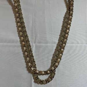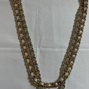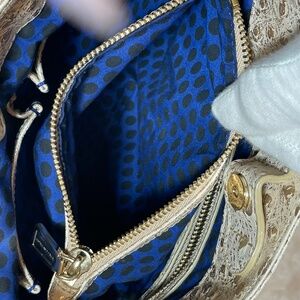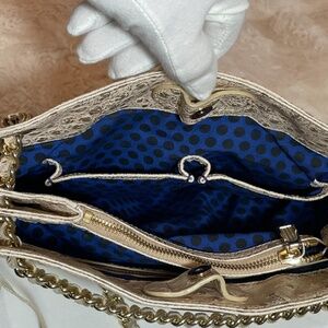 This metallic champagne colored ostrich-embossed leather handbag features a flap detail at the zip front pocket and zip gussets at the sides. Logo plate at back and long pulls at zips. Metal feet and antiqued gold hardware. Interwoven leather banding at double chain straps. Magnetic-snap main compartment closure. Lined interior features dividing zip pocket, additional zip pocket, card slot, and 2 patch pockets.