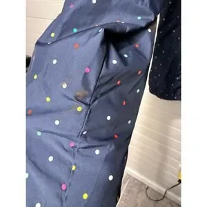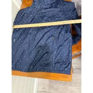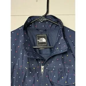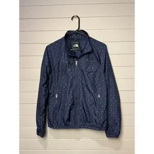 Excellent condition! Small brownish discoloration to right arm as seen in photo. The North Face navy lightweight jacket with polka dots. Features a full zip front closure, a zippered chest pocket, and two zippered hand pockets. The jacket is lined with breathable mesh and has elastic cuffs and hem for a comfortable fit. Perfect for casual outings, travel, or light outdoor activities.