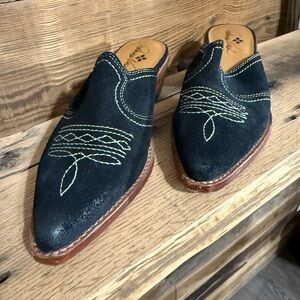 Patricia Nash Black Suede Pointed Slip-On Mules with Contrast Stitching