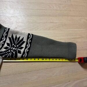 Brody full-zip knit sweater in a muted olive green with a striking black and white Nordic-inspired snowflake pattern across the chest and sleeves. Crafted from a warm lambswool blend, this heavy-knit piece features a mock neck and ribbed cuffs for a classic cold-weather look. The design incorporates a rugged, slightly distressed aesthetic with visible pilling and raw-edge detailing at the collar.