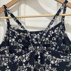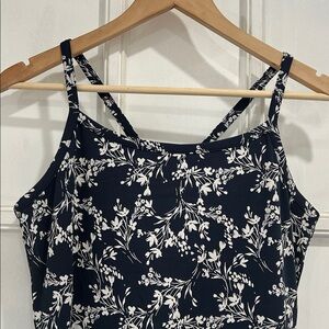 Style profile: sustainable organic cotton midi breathable flowy built in bra pockets strappy navy floral beachy casual easy comfort navy white floral dress