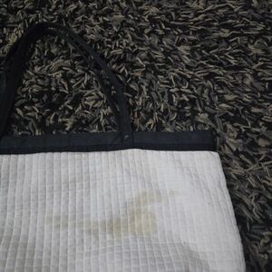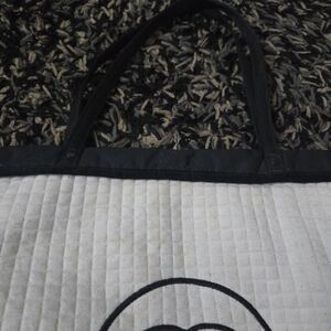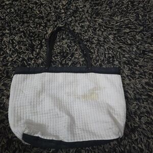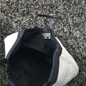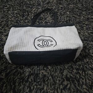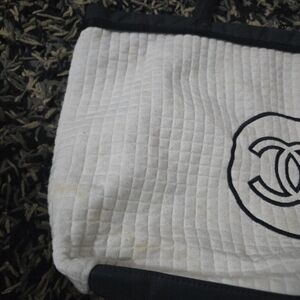 Authentic Chanel Beaute VIP Gift White Quilted cotton Canvas large Tote Bag - Black CC Logo. please note the stains as shown in the pictures. please take good look at all of the pictures for the exact condition and measurements.