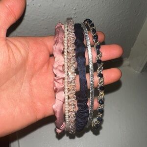 Elegant pink and black headband set with delicate bead and crystal embellishments. Soft pink satin and black fabric provide comfortable wear. Adds a polished, feminine touch to any outfit. Perfect for everyday styling or special occasions.